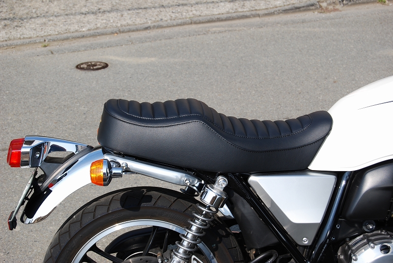 ※ご注文に際しては装着車両モデル・年式の確認が必要です。注文備考欄に入力をお願いします。適合車種:2010〜2018年 CB1100 14Lタンク・純正シートに比べシート高が32mmほど高くなっていますので、純正シートで膝や足元が窮屈に感じる方にお勧めです。ライダー側・パッセンジャー側ともに充分なスポンジの厚みと幅を持たせ、座面の傾斜も見直し。タンデムツーリングをする方にもお勧め、ソロツーリングの際は荷物の積載もし易くなります。・乗り心地が良くなるよう着座部分の幅はある程度確保し、足を下ろす部分は幅を細くしてありますので、足つきも良好です。・型の中で発砲させたインジェクションスポンジを使用。クッション性が良く経年劣化が少ないため、長くご愛用頂けます。【ご注意】CB1100EXには装着できません。シート裏側に書類入れはありません。【特徴】シート高:797cm・座面中央にプレーンブラックのタックロールを使用。縫い合わせのラインはステッチ仕上げ、ラインが座面周囲を囲むAタイプ。・タンデムベルトはボルト止めで標準装備。・取付は純正シート同様キーロック方式。・純正キャリア・トップボックスとの併用も可。