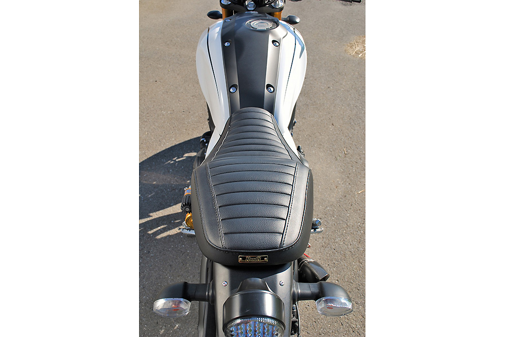 純正シート同等のシート高(830mm)ですが、内腿に当たる角張りが無く真っすぐに足を下せますので足つき性が格段に向上します。