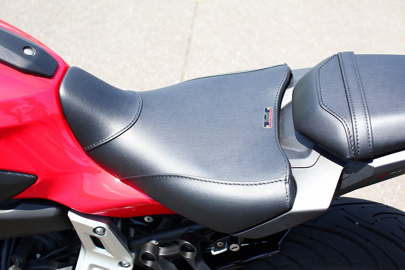着座部は乗り心地を確保するため純正シートよりも幅広にしていますが、足を下す部分は純正シートと同等の幅となっていますのでストレス無い足つきとなっています。