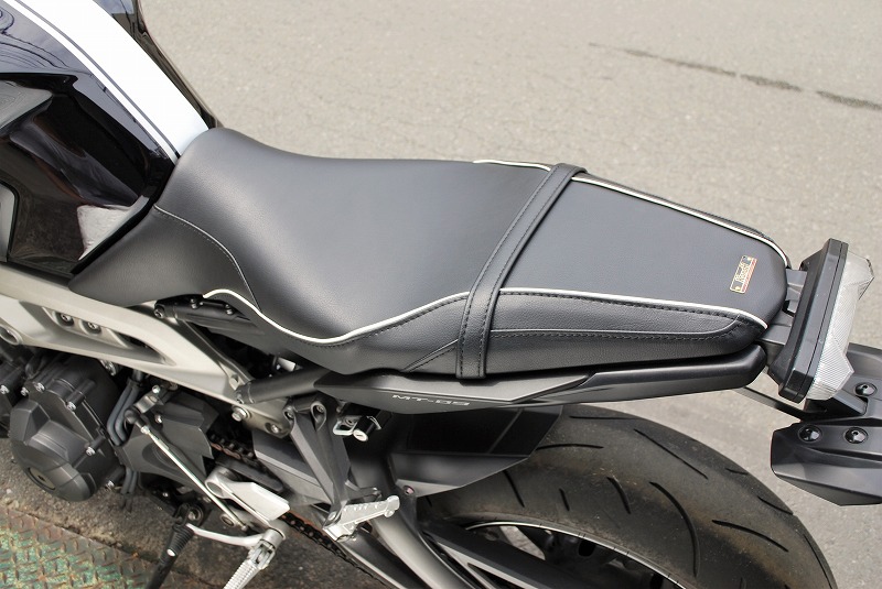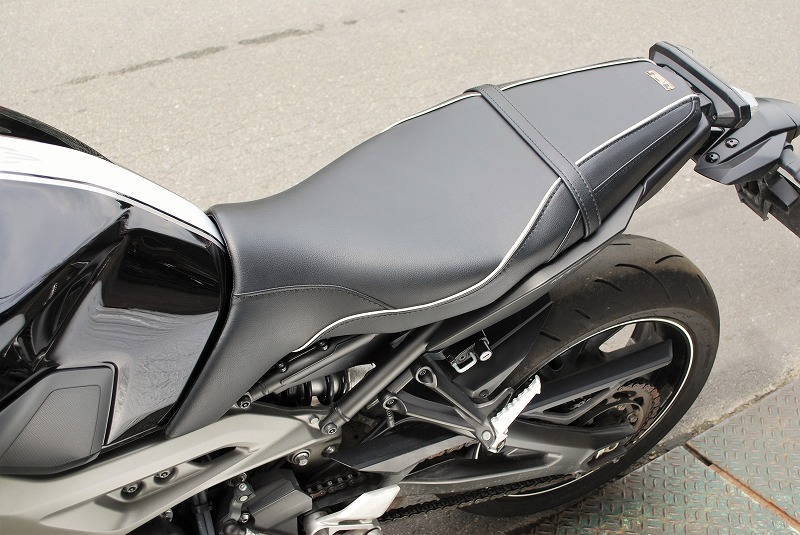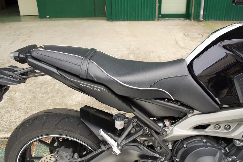 ※ご注文に際しては装着車両モデル・年式の確認が必要です。注文備考欄に入力をお願いします。適合車種: MT-09座面の前傾斜を水平にし、純正シートに対し20mm(’17?は15mm)座面を高くしてあります。着座位置が高くなる事により、膝の曲がりが緩やかになりステップ操作もし易くなります。ステップ荷重が増え、相対的にお尻(シート)への荷重が減り負担が軽減されます。スポンジの厚みが増した事により格段に乗り心地が良くなっていますので長距離ツーリングする方には特にお勧めです。着座部は乗り心地を確保するため純正シートよりも幅広にしていますが、足を下す部分は細くなっていますのでストレス無い足つきとなっています。シートベースから専用品となり、タンクカバーやサイドカウルとのチリも均一で車格が上がったように見えます。【シート高】・K&Hハイシート:835mm・?16純正シート:815mm・17?純正シート:820mm【特徴】タンデムベルト標準装備。(純正シートからフックの金具移設のみ必要です。)シートの取り付けは、純正シートと同様に鍵で行い、車体への加工は一切必要ありません。型の中で発砲させたインジェクションスポンジを使用していますから、クッション性良く経年変化が少ない為、長くご愛用いただけます。プレーンブラックレザーを使用。サイドの縫い合わせラインに白のパイピングを入っています。その他の縫い目は全てステッチ仕上げ。パッセンジャーサイドにステッチ切替が入るAタイプ。