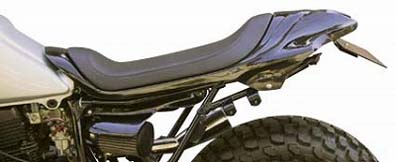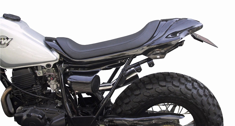 ※ご注文に際しては装着車両モデル・年式の確認が必要です。注文備考欄に入力をお願いします。適合車種: TW225シートカウル部分はF.R.P.製、ボルトオンで装着できます。レザー全体がプレーンレザーS-174コブラツイストガンファイターのシートに比べてレザー後部が短かめです。(座る部分の長さは変わりません。)F.R.P. 製のフェンダーは黒のゲルコート仕上げですから、そのままボルトオンで装着できます。また、ペイントすることもできます。ノーマルの状態でボルトオンで装着できます。ナンバープレート台、丸ランプ付き