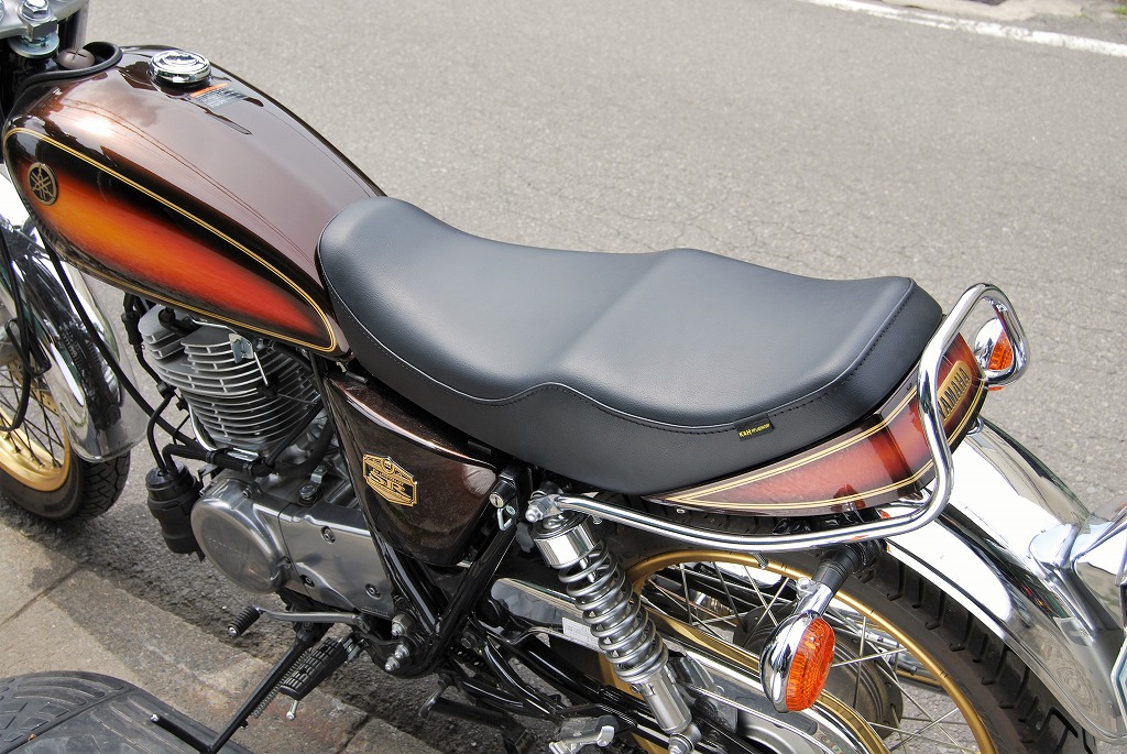 ※ご注文に際しては装着車両モデル・年式の確認が必要です。注文備考欄に入力をお願いします。適合車種: SR400全年式(78年モデルを除く)キャブレター / FIの全年式に装着可能な純正シートカウルが装着出来る段付きシートです。1978年式の初期型モデルには装着不可。型の中で発砲させたインジェクションスポンジを使用。クッション性が良く経年劣化が少ないため、長くご愛用頂けます。【シート高】770mm(純正シート 790mm)【特徴】レザー全体はプレーンブラックを使用、縫い合わせのラインはステッチで仕上げています。ステッチラインが1周するAタイプです。【装着】車体への取り付けには純正シートからシートダンパーを移設する必要があります。ガソリンタンク側に付属の取り付けステーを装着し、後ろ側は純正シートと同様純正シートボルトで固定します。純正グラブレールやK&H社製リアフェンダーとの併用も可能です。ワイズギア製キャリアと併用する場合は、取り付け金具を逆さ付けする必要があります。【ご注意】シートカウルは付属しませんのでお手持ちの純正シートから移設してご使用ください。キャブレターモデル用のカウル使用の場合は、カウル側の取り付け穴を3mmほど長穴加工する必要があります。