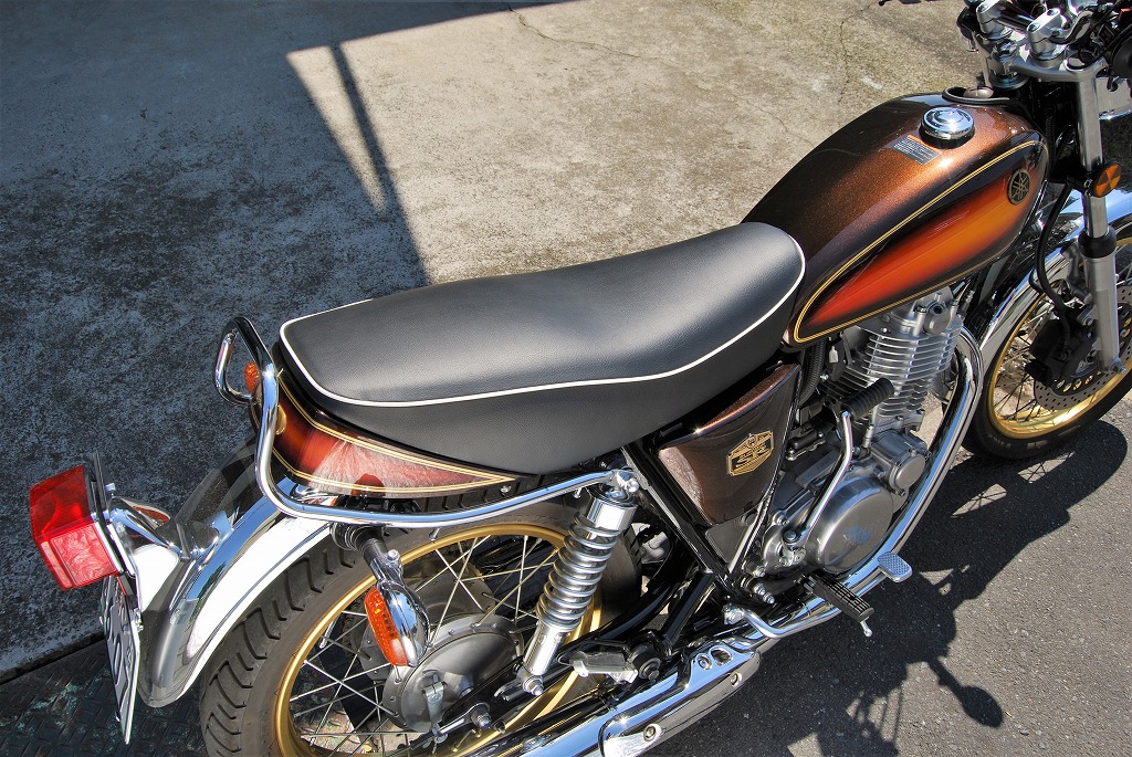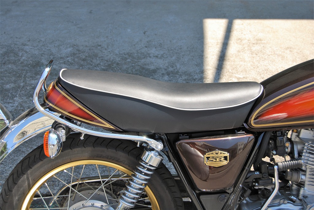 ※ご注文に際しては装着車両モデル・年式の確認が必要です。注文備考欄に入力をお願いします。適合車種: SR400全年式(78年モデルを除く)キャブレター / FIの全年式に装着可能な純正シートカウルが装着出来る段付きシートです。1978年式の初期型モデルには装着不可。乗り心地が良くなるよう着座部の座面幅を純正シートよりも広く取り、足を下す部分を細く角張りを無くすることより純正シート同様の足つきを実現。着座位置が高くなることにより膝の曲がりが緩くなり、乗車姿勢が立ち姿勢に近くなることで、お尻の荷重がステップへと移ります。ステップ荷重が増すことによりお尻への負担が軽減され、更にはステップでの車体操作もしやすくなります。ロングツーリングがより快適に楽しく行えるシートです。型の中で発砲させたインジェクションスポンジを使用。クッション性が良く経年劣化が少ないため、長くご愛用頂けます。【シート高】800mm(純正シート 790mm)【特徴】レザー全体はプレーンブラックを使用、中央の縫い合わせは白のパイピング仕上げです。パイピングラインがタンク側まで伸びるAタイプです。【装着】車体への取り付けには純正シートからシートダンパーを移設する必要があります。ガソリンタンク側に付属の取り付けステーを装着し、後ろ側は純正シートと同様純正シートボルトで固定します。純正グラブレールやK&H社製リアフェンダーとの併用も可能です。ワイズギア製キャリアと併用する場合は、取り付け金具を逆さ付けする必要があります。【ご注意】シートカウルは付属しませんのでお手持ちの純正シートから移設してご使用ください。キャブレターモデル用のカウル使用の場合は、カウル側の取り付け穴を3mmほど長穴加工する必要があります。
