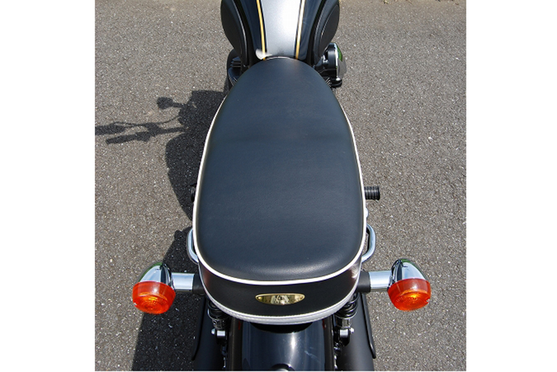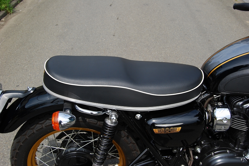 ※ご注文に際しては装着車両モデル・年式の確認が必要です。注文備考欄に入力をお願いします。適合車種: W650ライダー側・パッセンジャー側ともに充分なスポンジの厚みと幅を持たせ、座面の傾斜も見直し。タンデムツーリングをする方にもお勧め、ソロツーリングの際は荷物の積載もし易くなります。乗り心地が良くなるよう着座部分の幅はある程度確保し、足を下ろす部分は幅を細くしてありますので、足つきも良好です。型の中で発砲させたインジェクションスポンジを使用。クッション性が良く経年劣化が少ないため、長くご愛用頂けます。【ご注意】純正オプションのグラブレール、キャリアとの併用不可。【特徴】※シート高:825mm(※W800メーカー諸元シート高790mm)※シートサイズ:660mm(縦)290mm(横)105mm(スポンジ厚み)シート全体にプレーンブラックレザーを使用。縫い合わせのラインは白のパイピング、ベースラインにはシルバーレザーの切替を入れています。縫い合わせラインが座面周囲を囲むAタイプ。タンデムベルトはボルト止めで標準装備。シートはノーマルの取付金具・ボルトを使用し、ボルトオンで装着。純正のキーロック使用可能。