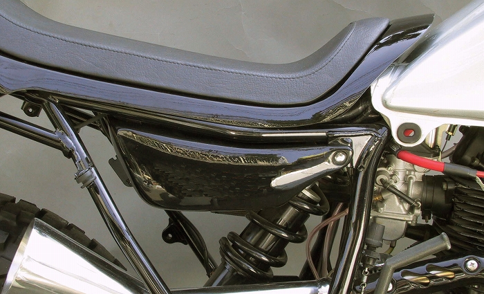 ※ご注文に際しては装着車両モデル・年式の確認が必要です。注文備考欄に入力をお願いします。F.R.P. 製のサイドカバーは黒のゲルコート仕上げですから、そのままボルトオンで装着できます。また、ペイントすることもできます。エアークリーナーボックスははずさないと装着できません。また、ペイントすることもできます。■FRP製 黒ゲルコート仕上げ