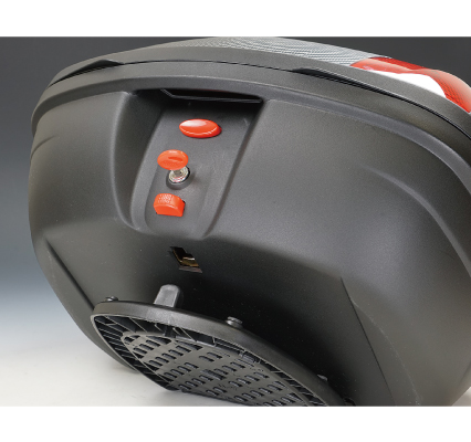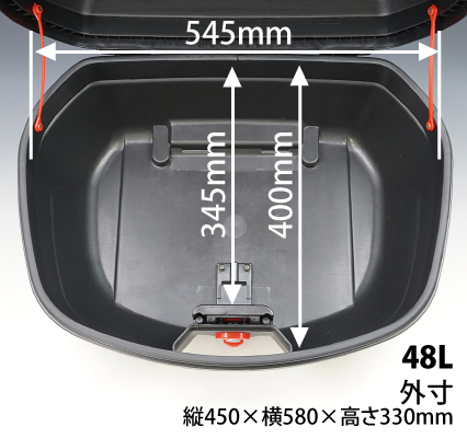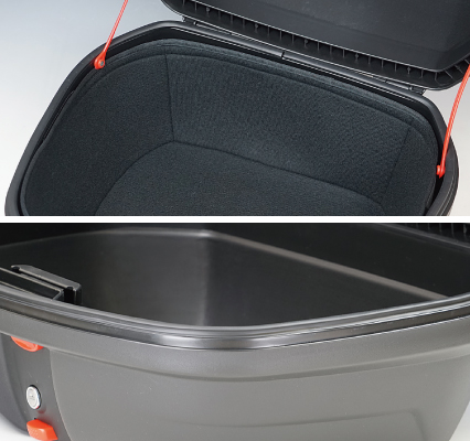 高い機能性とスタイリッシュなデザインのRALLY890 ハードトップケース。大容量の48リットルでヘルメットを二個収納可能(特殊形状を除く)。またボックス内部底側にはインナークッションを装備し振動から大切な荷物を保護します。外装の各所にカーボン柄を配し高級感を演出。汎用のベースプレートを車体に装着すれば、ハードトップケースをワンタッチで簡単に着脱可能。さらにベースプレートには振動吸収ゴムが装備されており、ハードトップケースとの振動防止に一役かっています。安心のキーロック式で、収納物の盗難や走行中にフタが開くのを防ぎます。キーロック中はハードトップケースをベースプレートから取り外せない盗難防止仕様。蓋はストッパー付きで荷物の出し入れがしやすいく安心、またボックス本体とフタの合わせ部分はゴムパッキンを装備し万全の防水仕様で安心です。