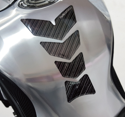 4パーツからなるセパレートタイプのタンクパッド。車両のタンク形状に応じて各パーツごとに貼付け位置の微調整ができ、4パーツ中3パーツのみ使うなど必要に応じて間引いて使用することも可能にした、汎用性を高めたタンクパッド。