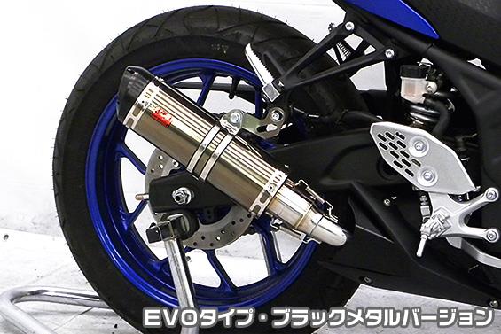 ※ヒートガードはポリッシュ仕上げとブラック仕上げで選択できます。※ヒートガードの画像はブラック仕上げとなっておりますが実際のお届け商品はポリッシュ仕上げとなります。ご注意くださいませ。新時代から導き出された究極のイノベーションデザインで非常にインパクトあるマフラーです。サイレンサーは【 ブラックメタルバージョン】です。ブラックメタルバージョンはバフ磨きしたSUS304ステンレスに特殊技法で着色した仕様で、シックで落ち着きのあるイメージです。アルミ素材から削り出したビレットタイプのエンドに、ブラックアルマイト処理を施した【 EVOタイプ 】消音用のバッフルが2個装備されている【 ダブルバッフル仕様 】となっており、バッフル無し、バッフル1個装着、バッフル2個装着と3種類の排気音を選べるサウンドセレクトスタイルになっています。バッフルはSUS304ステンレスタイプ(EVOタイプはプレートタイプ)とアルミタイプの2種類のバッフルが装備されています。音量はバッフル2個装着時の排気音量が 約86db(約87db)(法定規制値内音量)、バッフル1個装着時の排気音量が 約88db(約89db)、バッフル非装着時の排気音量が 約90db(約92db) です。※( )内の音量はYZF-R3です。音質も耳障りな音でなく重低音のサウンドになっていますので、ノーマルマフラーではちょっと物足りない方にオススメです。サイレンサーはストレート構造ではなく隔壁構造になっていますので、音量は静かめに抑えられており近所迷惑になる事無く安心して走行できます。低中速を落とすことなく高回転でスムーズに回り扱いやすい設定になっています。振動防止のためサイレンサーとエキパイが2分割となる安心設計になっています。サイレンサーは、2点止めになっていますのでしっかりと固定でき、耐久性にも優れています。無加工ボルトオンにて装着できますので、必要な工具があれば簡単に取り付けできます。(取り付けに必要なボルト類は全て付属しております。)テールパイプとエキパイとの接続部分を隠し、空力性能を向上させる ヒートガード を 標準装備 しております。ポリッシュ仕上げ です。※ヒートガードはノーマルカウル装着車のみ適合します。サイレンサーバンドにはスリットタイプを採用してデザインにもこだわっています。サイレンサーの固定にはサイレンサーバンドを採用し、バフ仕上げを施したSUS304ステンレス製丸棒で組んだステーを介して固定しておりますので、従来のステーの固定より車体と調和した高級感あふれるマフラーです。某有名マフラーメーカーの製作になりますので、低価格ながら完成度は非常に高い作りになっています。SUS304ステンレス製で、エキパイからサイレンサーまでバフ仕上げを施しています。注意※サイレンサー部分だけ取り替えるスリップオンタイプの商品です。フルエキゾーストタイプのマフラーではありませんのでご注意ください。※平成22年4月1日より施行された認証制度に適合する認証マフラーではありません。ご理解の程よろしくお願い致します。※ヒートガードはポリッシュ仕上げとブラック仕上げで選択できます。※ヒートガードの画像はブラック仕上げとなっておりますが実際のお届け商品はポリッシュ仕上げとなります。ご注意くださいませ。