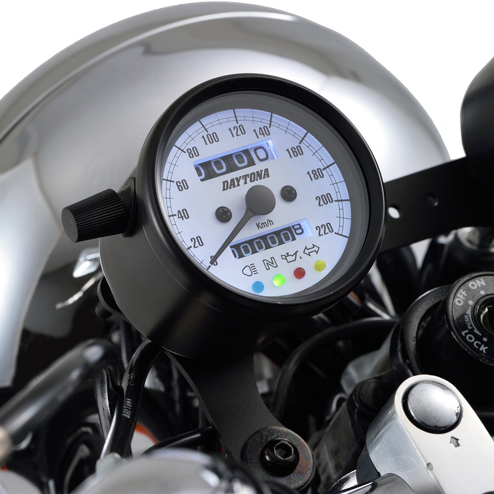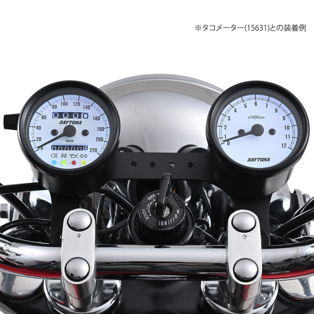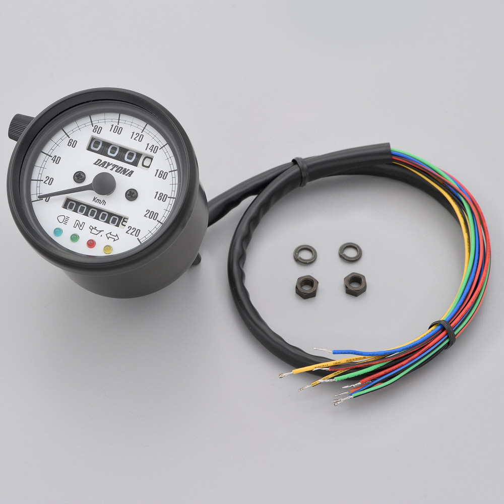 機械式スピードメーター φ60 ホワイトLED照明 220km/h ブラックボディ ホワイトパネル インジケーター付き DAYTONA(デイトナ)