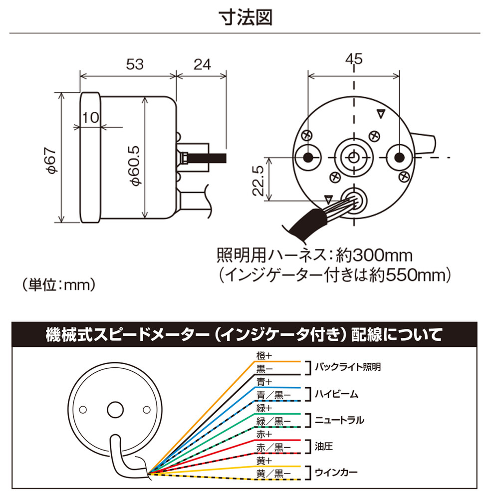 旧車カスタム素材の定番、復活。クラシカルなパネルデザインのスピードメーター。夜間でも視認しやすいLEDバックライトの文字盤を採用。インジケーター付き(ハイビーム、ニュートラル、油圧、ウインカー)220km/hブラックボディ ホワイトパネル取り付けには防振メーターステーが必要です12Vバッテリー車専用※取り付けには、防振メーターステーが必要です。※スピードメーターは国産モデルで一般な「60km/h=1,400rpm」規格の純正機械式メーター車(メーターケーブルを使用する車両)であれば基本的に使用できます。メーター規格が異なる外車や、一部旧車などには使用できません。※12Vバッテリー車専用。バッテリーレス車、6Vバッテリー車(12V電装にコンバートしたモデルも含む)では正常に作動しません。※完全防水ではありません。メーター内外の気温差や湿度により、ガラス面が曇る場合があります。※純正メーターを取り外すことによって、各種インジケーターが使用できなくなる場合があります。必要に応じて別途ご用意ください。※メーターケーブルは消耗品です。アウターチューブに亀裂や破損があると、メーター内部に水分や油分、埃などが侵入し、故障の原因になります。機械式メーターを交換する際は必ずメーターケーブルの点検も同時に行ない、必要に応じて新品に交換してください。※スピードメーターとタコメーターは内部構造と文字盤色の違いにより、発光状態(特に夜間)の差が出てしまいます。あらかじめご了承ください。※ハーネスの結線は車両に合わせた加工が必要です。ギボシ端子等は別途ご用意ください。