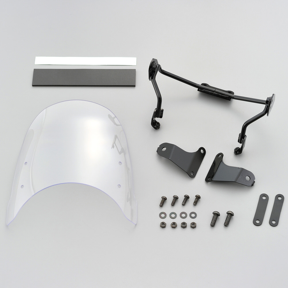 ロングセラーであるエアロバイザーのスクリーンとステーがセットになった車種別専用キット。スクリーン部:ポリカーボネート製(3mm)ステー部:スチール製黒塗装※スクリーンは傷つきやすいので、乾ぶきはしないでください。※スクリーンが汚れた場合は、傷のつきにくいやわらかい布と中性洗剤を使用して多量の水で洗い流してください。※ガソリン・シンナー等有機溶剤・コンパウンド入りのクリーナー等は使用しないでください。※スクリーンは、太陽光を直接当てると、小さな領域に集光する光学的特性上、車体の他の部分に損傷を与える場合がありますので、直射日光が当たったままの状態で駐車しないでください。REBEL250/500(Sエディション含む) 2020年モデル不可。