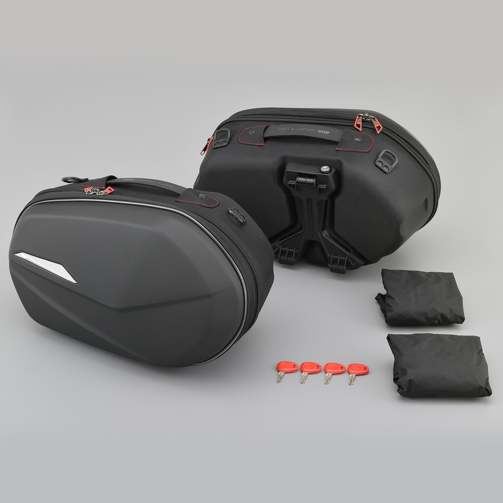 スタイリッシュなデザインが特徴のセミハードサイドバッグ。容量可変式で片側25リットルを30リットルに拡張可能。