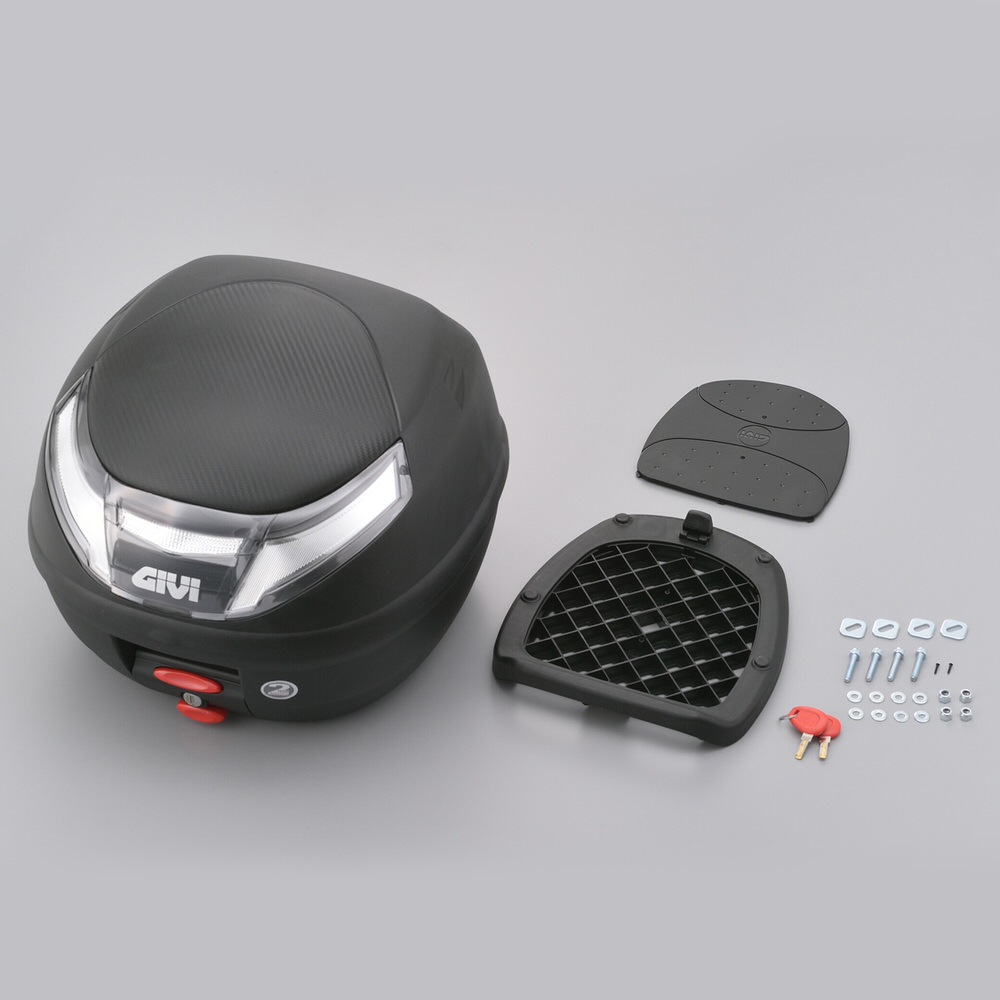 汎用ベース付「モノロック」シリーズトップケース。リアキャリア既設のほとんどの車種にそのまま取り付けが可能です。ヘルメットが1つ入るコンパクトサイズ。原付スクーターでの通勤・通学に最適。カーボン風仕上げトップパネル。重量:ベース込み2.7kg奥行×幅×高さ(外側)…398×393×308(mm)最大積載重量:3kg汎用ベース付属※キャリア本体の積載制限以上は積載しないでください。※防水性を考慮した設計をしておりますが、完全防水ではありません。※レンズ部に防水性はありません。