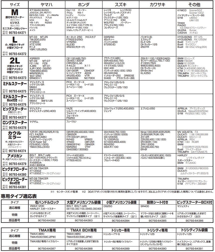 参考装着車両例:トリシティ300 BOXなし車トリシティ300のスタンダード車にピッタリのサイズに設計しています。両サイドに立体大型ベンチレーションを設け、カバー内の湿気を効果的に逃がします。万一放火などで火をつけられた場合、炎が燃え広がらないように加工された防炎素材を使用しています。2色の切返しデザインにより、装着時に前後の位置が一目で分かります。アジャストコードで前後どちらからでも簡単にしっかり絞ることができます。オリジナルスリットにより大型ロックに対応しているため、前輪でも後輪でも車体カバーの上からロックできます。アジャストコードによりカバーを車体にフィットさせバタつきを抑えます。素材東レ・テトロンオックス糸素材に特殊高級アクリル樹脂難燃剤配合ハードWコートフッ素系撥水加工ポリエステル100%(財)日本防炎協会認定素材ご注意※タンデムバックレスト装着車は標準タイプで対応可能です。※走行直後のエンジン、マフラーは高温になっています。バイクカバーがとける恐れがありますので、十分冷えてからご使用ください。※生地には防水加工、縫製糸には撥水加工を施してありますが、完全防水ではありませんので雨量によっては車体が濡れる場合があります。※塩ビ素材のウインドシールドは熱変形する場合があります。高温下での使用はお控えください。※強風時には風がバイクカバー内に入り込む恐れがあります。転倒防止を含め、十分な管理をしてください。※本製品はハンドルを左にきってかぶせるタイプです。右ハンドルロック車はロックができなくなります。※車体形状によりタイヤの接地面までかぶらない場合があります。※装着オプションによっては適合しない場合があります。