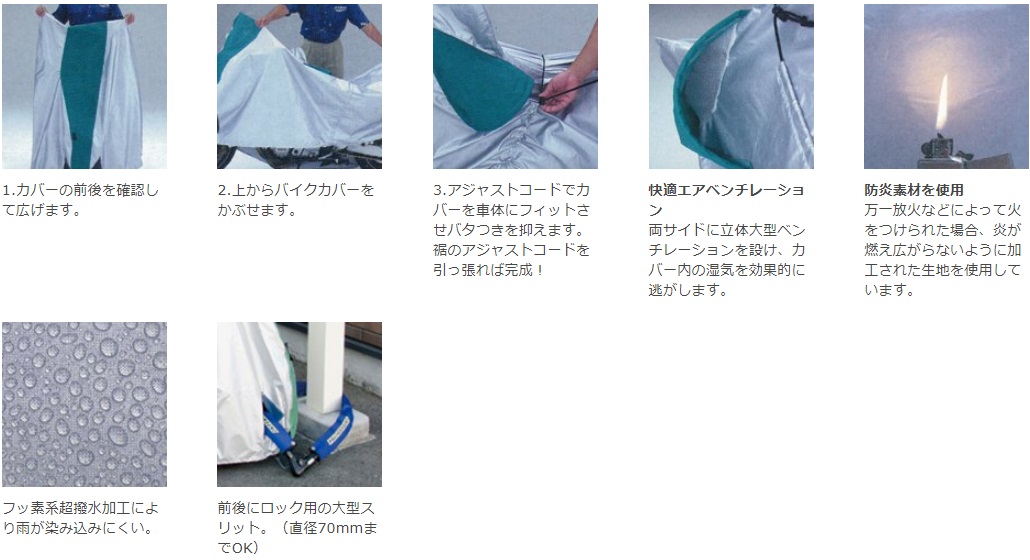 参考装着車両例:NIKEN/NIKEN GT両サイドに立体大型ベンチレーションを設け、カバー内の湿気を効果的に逃がします。万一放火などで火をつけられた場合、炎が燃え広がらないように加工された防炎素材を使用しています。2色の切返しデザインにより、装着時に前後の位置が一目で分かります。アジャストコードで前後どちらからでも簡単にしっかり絞ることができます。オリジナルスリットにより大型ロックに対応しているため、前輪でも後輪でも車体カバーの上からロックできます。アジャストコードによりカバーを車体にフィットさせバタつきを抑えます。NIKEN/NIKEN GT 専用設計。新たに採用したリア周りのサイズ調整ホックにより、スタンダード状態以外に純正オプションのトップケースやエアロサイドケースを装着した状態にも対応が可能になりました。素材東レ・テトロンオックス糸素材に特殊高級アクリル樹脂難燃剤配合ハードWコートフッ素系撥水加工ポリエステル100%(財)日本防炎協会認定素材ご注意※走行直後のエンジン、マフラーは高温になっています。バイクカバーがとける恐れがありますので、十分冷えてからご使用ください。※生地には防水加工、縫製糸には撥水加工を施してありますが、完全防水ではありませんので雨量によっては車体が濡れる場合があります。※塩ビ素材のウインドシールドは熱変形する場合があります。高温下での使用はお控えください。※強風時には風がバイクカバー内に入り込む恐れがあります。転倒防止を含め、十分な管理をしてください。※純正オプション以外を装着した場合、サイズが適合しない場合があります。※装着オプションによっては適合しない場合があります。
