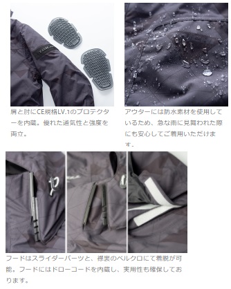 防水機能とプロテクション等のライディング機能を兼ね備えた、タウンユースにも適したカジュアルウィンターパーカ。急な雨に見舞われた際にも安心してご使用いただけます。フードと中綿入りインナージャケットは着脱可能で、気温やコンディションに合わせた着こなしが可能です。・着脱式フード・着脱式中綿入りインナージャケット