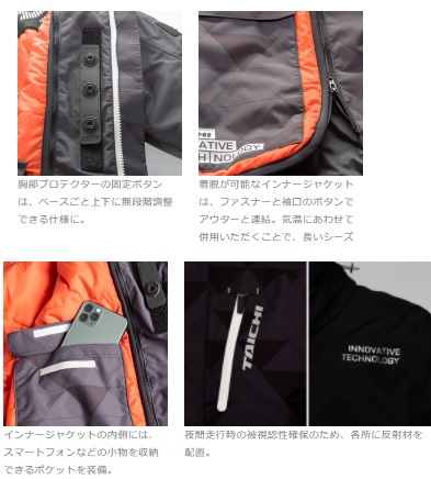 防水機能とプロテクション等のライディング機能を兼ね備えた、タウンユースにも適したカジュアルウィンターパーカ。急な雨に見舞われた際にも安心してご使用いただけます。フードと中綿入りインナージャケットは着脱可能で、気温やコンディションに合わせた着こなしが可能です。・着脱式フード・着脱式中綿入りインナージャケット