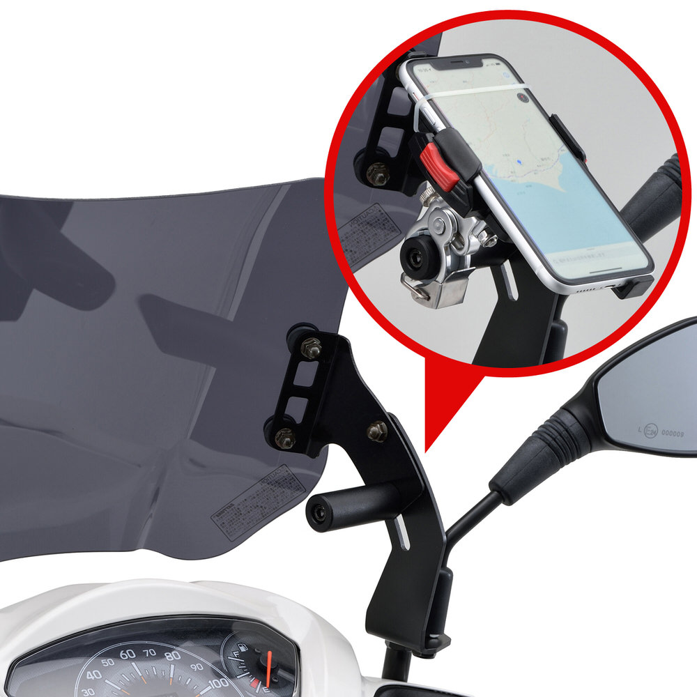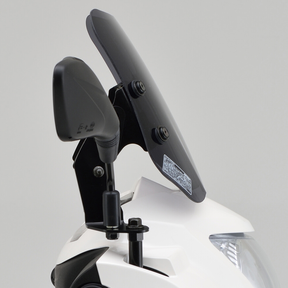 スタイリッシュなエアロフォルムのウインドシールド。ポリカーボネイト(厚さ3mm)を採用。同厚のアクリルに対し約30倍の強度を持ち、高い透明度と耐久性を両立。またハードコート処理を施すことで耐傷性もアップしています。ウインドシールドの角度調整(約10度)が可能な車種専用の取付ステー付き。スマホやメーター等が装着可能なφ22.2のオプションバー付属。角度調整(約10度)が可能な車種専用の取付ステー付きスマホなど装着可能なφ22.2のオプションバー付属シールド寸法:高さ260mm(センター230mm)×幅315mmステー:スチール製黒塗装仕上げ※ウインドシールドは、小さな領域に集光する光学的特性上、太陽光を直接当てると車体の他の部分に損傷を与える場合がありますので、直射日光が当たったままの状態で駐車しないでください。