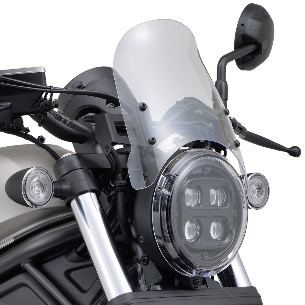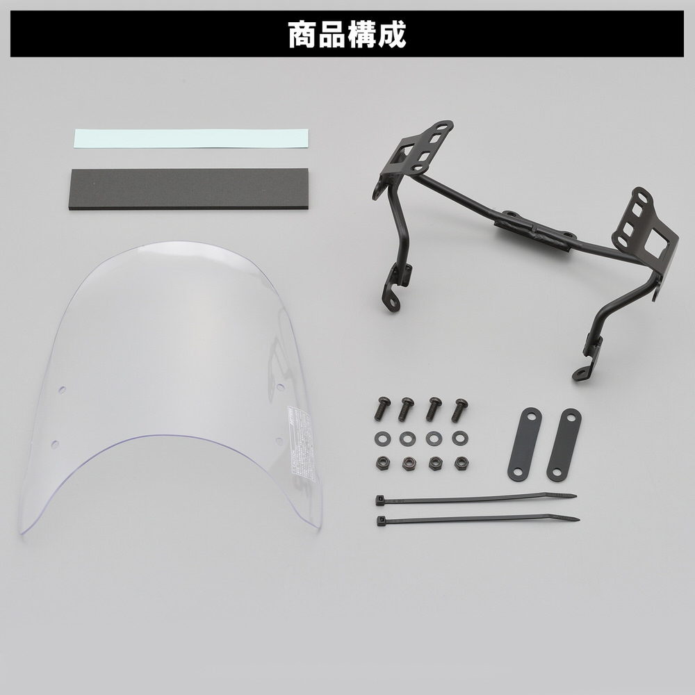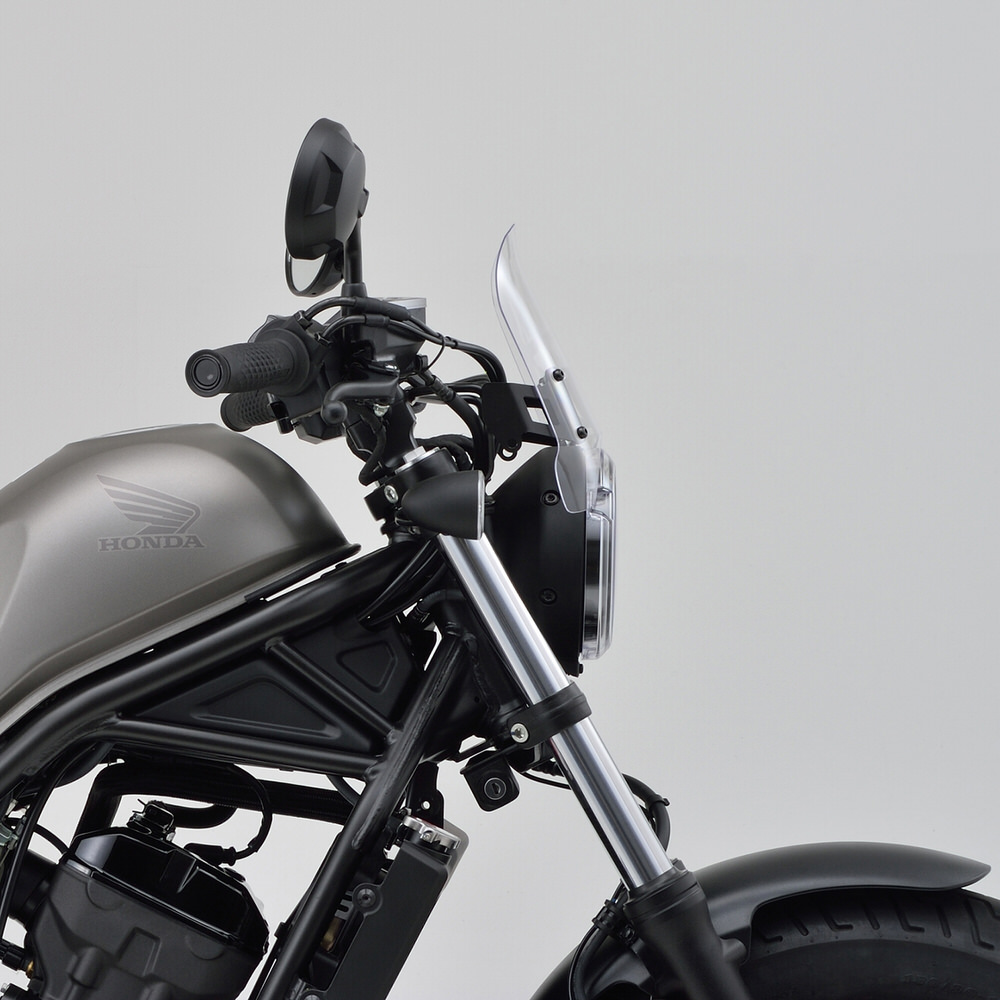 エアロバイザーのスクリーンとステーがセットになった車種別専用キット。スクリーンカラー:クリアースクリーン部:ポリカーボネート製(3mm)ステー部:スチール製黒塗装社外ウインカー装着用のサービスホール(M8)付き※REBEL250 S Edition装着不可。※ホンダ純正オプションのヘッドライトカウルとの同時装着不可。※スクリーンは傷つきやすいので、乾ぶきはしないでください。※スクリーンが汚れた場合は、傷のつきにくいやわらかい布と中性洗剤を使用して多量の水で洗い流してください。※ガソリン・シンナー等有機溶剤・コンパウンド入りのクリーナー等は使用しないでください。※スクリーンは、太陽光を直接当てると、小さな領域に集光する光学的特性上、車体の他の部分に損傷を与える場合がありますので、直射日光が当たったままの状態で駐車しないでください。
