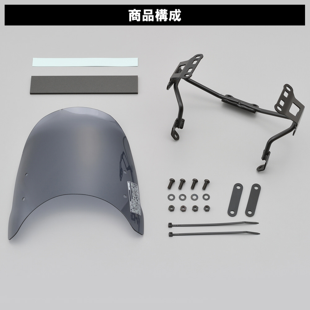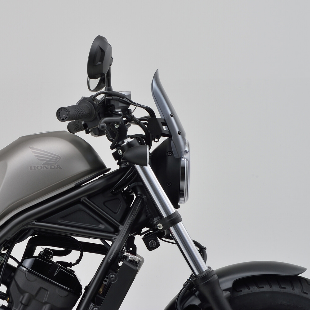 エアロバイザーのスクリーンとステーがセットになった車種別専用キット。スクリーンカラー:スモークスクリーン部:ポリカーボネート製(3mm)ステー部:スチール製黒塗装社外ウインカー装着用のサービスホール(M8)付き※REBEL250 S Edition装着不可。※ホンダ純正オプションのヘッドライトカウルとの同時装着不可。※スクリーンは傷つきやすいので、乾ぶきはしないでください。※スクリーンが汚れた場合は、傷のつきにくいやわらかい布と中性洗剤を使用して多量の水で洗い流してください。※ガソリン・シンナー等有機溶剤・コンパウンド入りのクリーナー等は使用しないでください。※スクリーンは、太陽光を直接当てると、小さな領域に集光する光学的特性上、車体の他の部分に損傷を与える場合がありますので、直射日光が当たったままの状態で駐車しないでください。