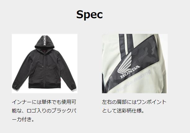 素材表地:ナイロン100%/PU裏地:ポリエステル100%着脱インナー:コットン50%/ポリエステル50%標準装備:EVAソフトプロテクター(バック(脊椎)用/ショルダー用/エルボー用)オプション対応:テクセルチェストプロテクター(一体型タイプ/セパレートタイプ)艶やかな素材感に、スポーティなムードグロッシーな素材感と特徴的なテキスタイルでスポーツイメージを携えたジャケットです。肉厚ながら、しなやかな防風・防寒シェルを使用。フードは着脱可能で3WAYの着回しが可能です。袖口はレーシンググローブとのマッチングを考慮したカフス仕様。