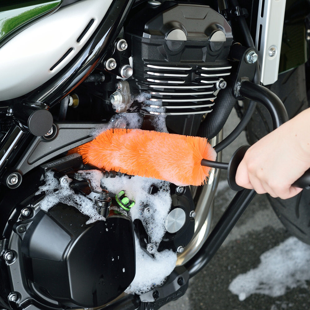 エンジンやサスペンションなど、手が入りにくい場所の洗車に最適。ブラシを折り曲げて作業できます。ブラシ先端には傷防止用カバーがついているので、車体を傷つけず安心です。エンジンなど手が入りにくい場所の洗車に最適折り曲げ可能なブラシ先端に傷防止用カバー付き※塗装部分への使用はできません。