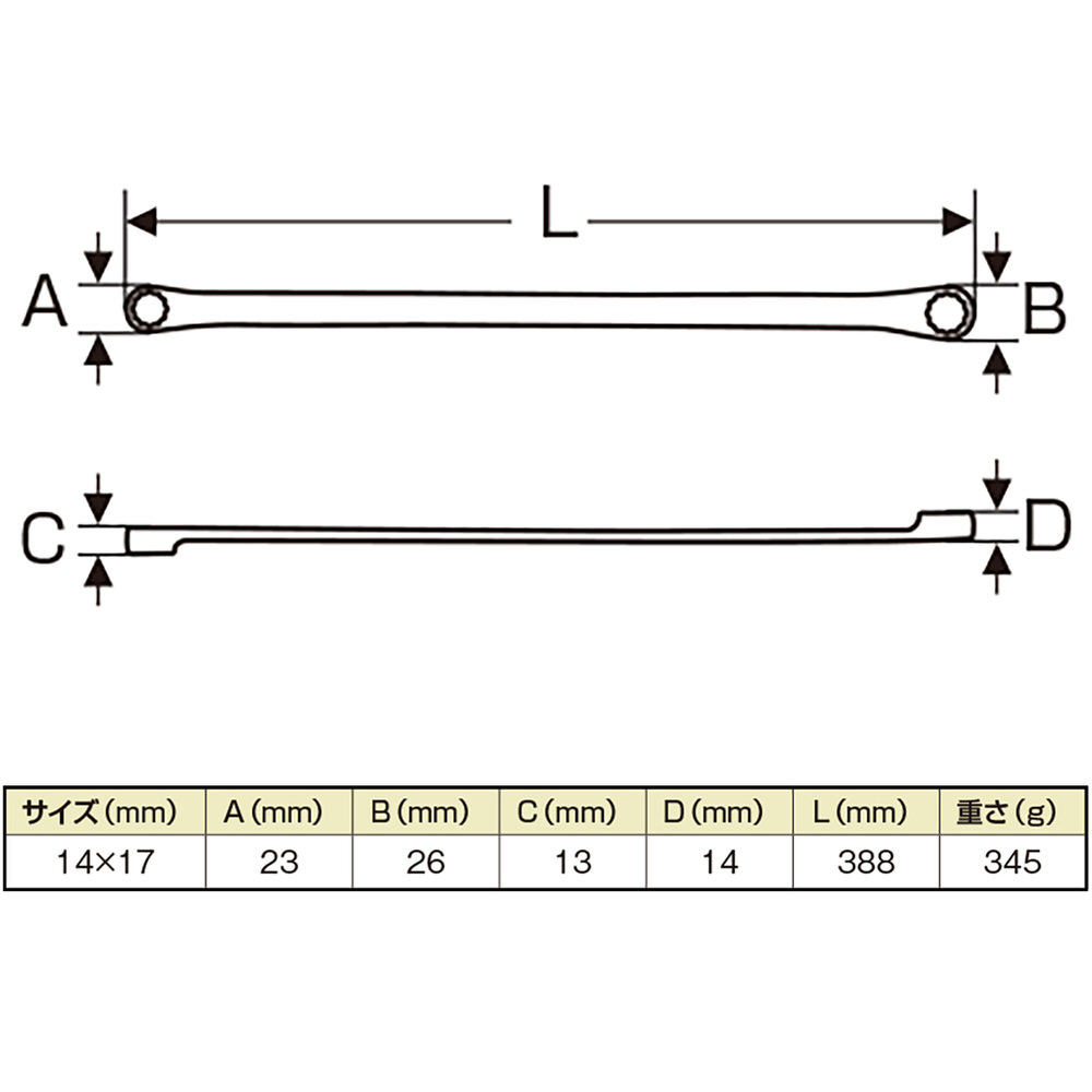 スタンダード長のメガネレンチに比べて長いので力が掛けやすく、硬く締まったボルトを緩めるのに便利です。せまく奥まった箇所や足回り、下周りのドレンボルト等もカンタンに作業できます。サイズ:14×17mm長くて奥まった箇所の作業に便利材質:クロムバナジウム鋼