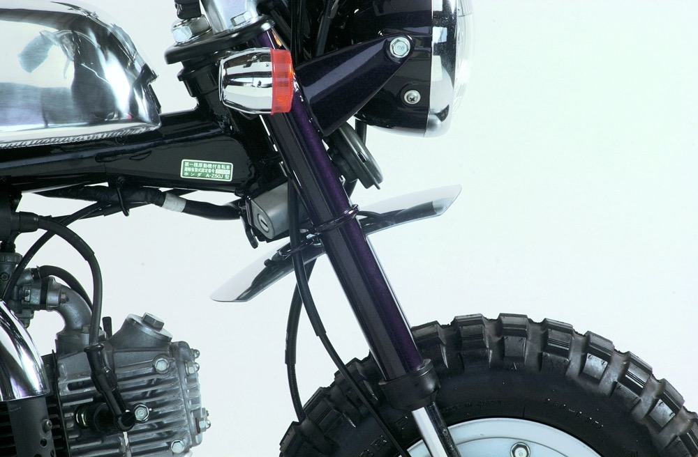 取付ボルトオン、アルミバフ仕上げ全長215mm幅110mmA型純正タイプフロントフェンダー。6V/12V用。6Vモンキー(Z50J-1300017〜1805927)6Vゴリラ(Z50J-1300027〜)12Vモンキー(Z50J-2000001〜)12Vゴリラ(Z50J-2500001〜)12Vモンキー/ゴリラ(AB27-1000001〜1899999)12Vモンキー(FI)(AB27-1900001〜)