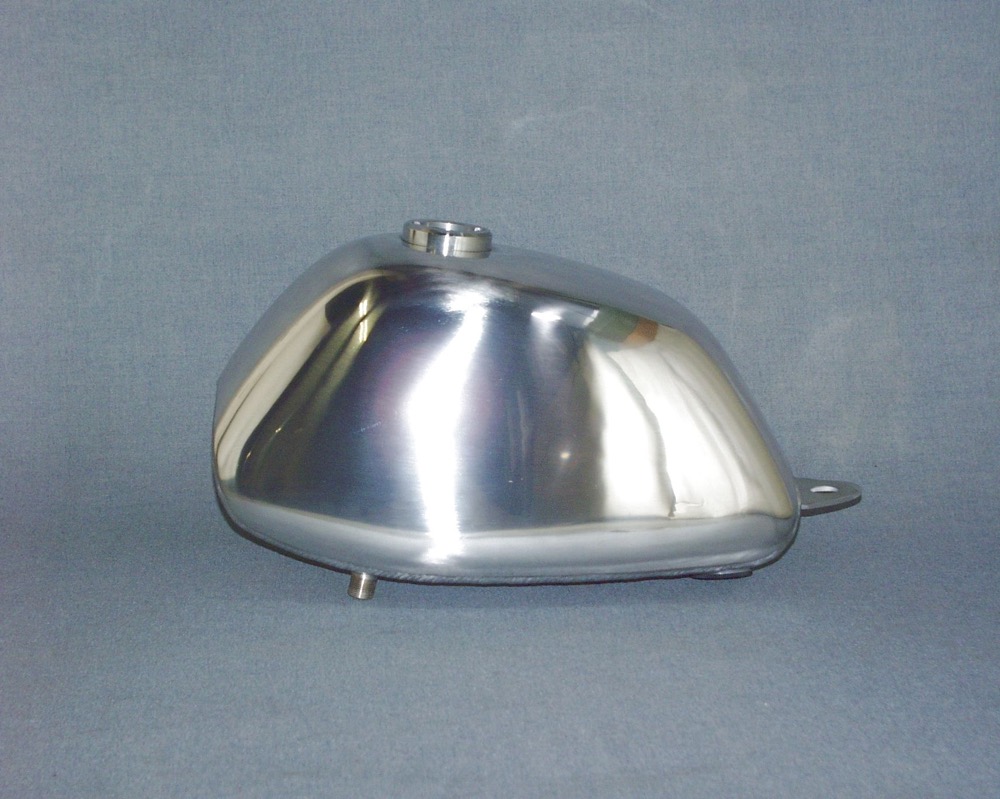 取付ボルトオン、アルミバフ仕上げ、6V車専用、約4.0リットル。F.No.〜1195595まで。タンクキャップ&コック別、純正キャップ、純正シート可。コックは12V車用を使用して下さい。BIGキャブに交換した場合でもキャフに゛干渉しない様コック取付位置を前方に移動済み。