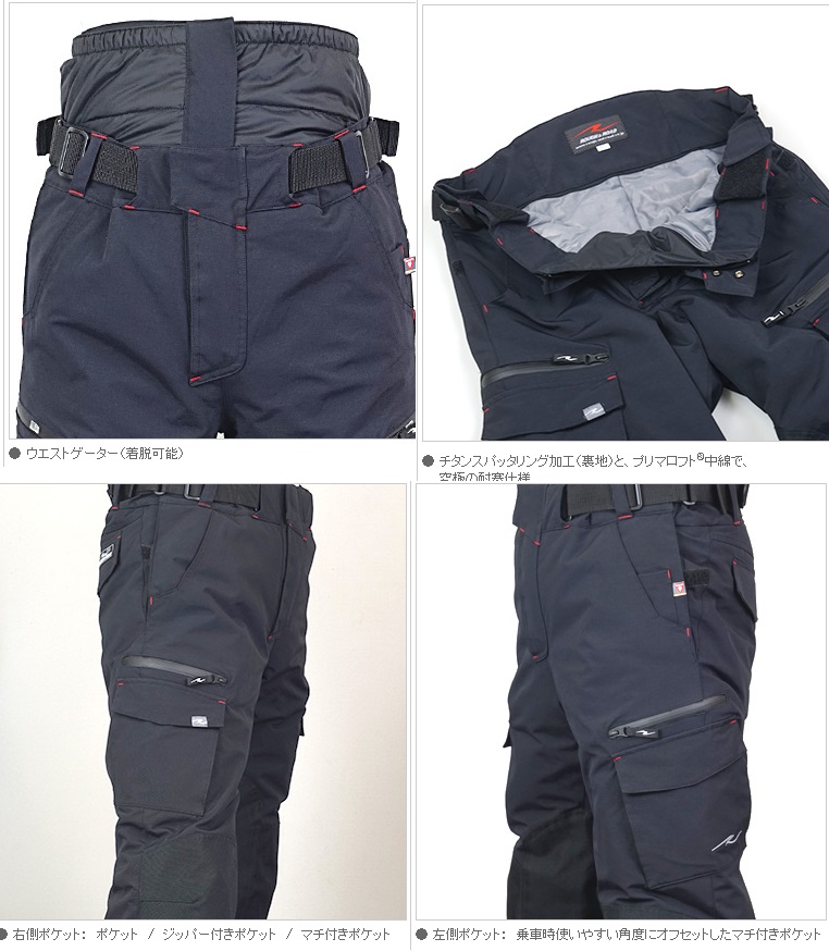 厳冬の季節、防寒性能を極めることにフォーカスしたスペシャルウォームオーバーパンツ。 腰は脱着可能なウエストゲーターを備え腰回りの体熱を逃さず、外からの寒風の侵入をシャットアウト、裾にもストームガードを備え寒気の侵入を許しません。裏地は足を通しやすい素材で、脱ぎ履きがスムーズです。裏地にはチタンをスパッタリング加工を施したトリコットが体熱を効果的に反射し高効率で下半身を保温。さらに、中綿には超軽量・イージーメンテナンス性を兼ね備えた最高クラスの保温力を誇るPrimaLoftGold Insulation with Cross Core(プリマロフト・ゴールド・インサレーション・ウィズ・クロス・コア)を採用し究極の防寒性を誇ります。プリマロフトは、羽毛に代わる画期的な超微細マイクロファイバー素材で羽毛のように軽くて暖かい保温性と柔軟性を発揮するだけではなく、羽毛にはない撥水性を備えており水にも強い機能性(メンテナンス性・断熱性・防寒テクノロジー)と、過酷な環境でも使える高い実用性を備えた先進の人工羽毛です。 さらに膝と腰にプロテクションパッドを標準装備、また9ポケットのカーゴスタイルで安心便利にも抜かりはありません。最高の機能と最高の素材を惜しみなく投入した究極(ポーラー)オーバーパンツは冬でしか味わえない景色を求める、元気なライダーをどこまでもサポート。防寒・防水・防風・保温することを高次元で両立させたスペシャルウインターオーバーパンツです。SIZE(inch):MW-short(30-36、股下70-76cm)MATERIAL:表地/ナイロンタッサー、600Dバリアクロス裏地/トリコット チタンスパッタリング加工、ナイロンタフタ 中綿/プリマロフトPROTECTOR:ニーシンガード標準装備OPTION:RR10085 ウエストサイドパッド