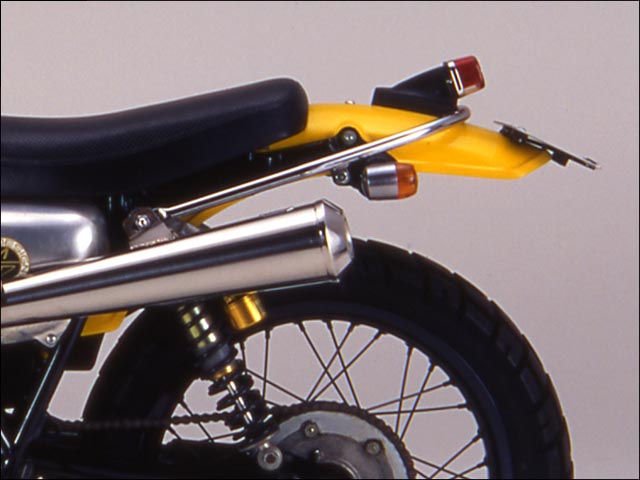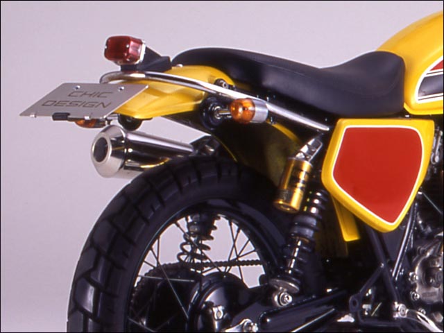 スポーティーさを強調するスクランブラータイプのフェンダーです。フロントはパイプ製のスタビライザーが標準装備でハードな走りをバックアップ。スチール製のスタビライザーはクロームメッキとブラック塗装仕上げから選択することが可能です。リアはアップタイプの軽快で伸びやかな形状で、躍動感溢れるシルエットを手に入れることができます。マットガード一体構造で4点止め。テールランプは好みに合わせて別途ご用意下さい。フェンダー本体は軽量なFRP製サフェーサーコート仕上げ。シンプルなデザインでスクランブラーやトラッカースタイルなどに最適です。※ 同社製『スタビライザー』同時装着不可