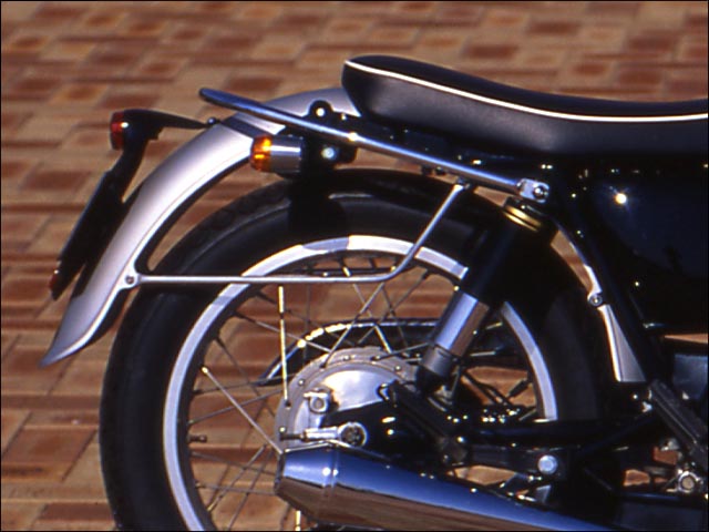 エンド部分に軽いフレアーを付け、柔らかいラインを描くシルエットを持ったスポーティーなフェンダーです。周囲の縁にはカッチリとしたリブ(段差)設けシャープな印象をデザインしています。アルミパイプ製のステーを標準で装備しており、振動対策とともにクラシカルなムードを演出しています。若干長めのフォルムで60年代の雰囲気を醸し出しており、クラシックカフェレーサーには最適なフェンダーです。