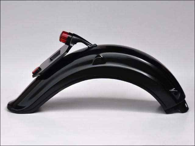 最もオーソドックスなミディアムロングのクラシックフェンダーで、シンプルにして流れるようなラインを持ったデザインです。エンド部分に向かってややフレアーした形状と洗練された造形美で、程よい重厚感と上質な存在感を纏わせます。フェンダー本体はFRP製、サフェーサーコート仕上げで、取り付け部分にはアルミのカラーを介して耐久性を高めています。クラシックテールランプ(ラウンドS)付きで配線加工済みです。リアウインカーの装着はフェンダー側面に穴開け加工を施すか、別途「テールウインカーステー」をご利用ください。フェンダー本体に十分な強度をもたせていますので、タンデム(二人乗り)走行も可能です。