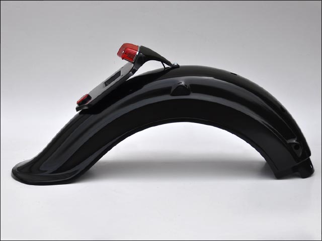 大きくフレアーしたエンド部分と深くタイヤを覆うフォルムをもつロングタイプのリアフェンダー。古(いにしえ)の旧車を思わせるエレガントなシルエットが印象的です。フェンダー本体はFRP製、サフェーサーコート仕上げで、取り付け部分にはアルミのカラーを介して耐久性を高めています。クラシックテールランプ(ルーカスタイプS)付きで配線加工済みです。リアウインカーの装着はフェンダー側面に穴開け加工を施すか、別途「テールウインカーステー」をご利用ください。フェンダー本体に十分な強度をもたせていますので、タンデム(二人乗り)走行も可能です。