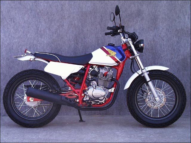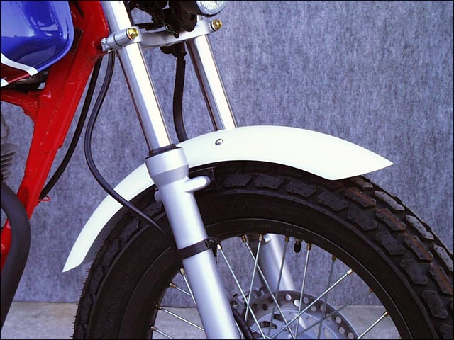 断面が緩やかなカーブになっているシンプルな形状のフロントフェンダー。縁にリブのないデザインのため、好みの長さにカットしての使用も可能です。プレーンタイプのフェンダーにFTR専用のフィッティングキットが組み込まれています。本体はFRP製、サフェーサーコート仕上げ。FTR(223)、CB223S全年式にボルトオン設計(FTR250は不可)。