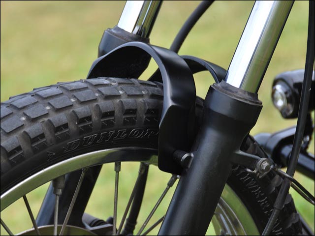 左右のボトムケース上部を連結する事で、ブレーキング時やコーナーリング時に起きるフロントフォークのねじれを解消する機能部品。剛性を高めるため、ガラスマットの他にロービングクロスを積層したFRP製。装着時の存在感を極力抑えているため、軽快感を損なわずに装着することが可能です。中央部を大胆に肉抜きした形状で、ラウンドタイプよりも軽量に仕上げられています。