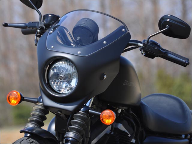 ※2004年以降のXLモデルに適合(バイザーを介してヘッドライトをマウントするモデルに限ります)。確認済適合車種:09-20年XL883N、05-10年XL883L、06-15年XL883R、07-11年XL1200L、08-12年XL1200N、04-09年XL1200R、07年XL50小振りで低く構えたスタイリングのライトカウル。スクリーンは極限まで低い位置にセットされ、ライト下には小振りなチンスポイラーを備えています。カウル本体はFRP製、裏面サフェースマット仕上げ。スクリーンは2mm厚のアクリル製を採用し、スポーツ走行からツーリングまで優れた整流効果を発揮します。左右と下部の3点ラバーマウントを採用。装着には別途ヘッドライトローダウンキットが必要となります。※装着時、光軸を調整する必要があります。※ハンドル形状によっては純正ハンドルであっても干渉する場合があります。(XL883、XL883Nなどに使用されている標準ハンドルでは、マスターシリンダーに僅かに干渉するため、ハンドル角度を調整する必要があります)