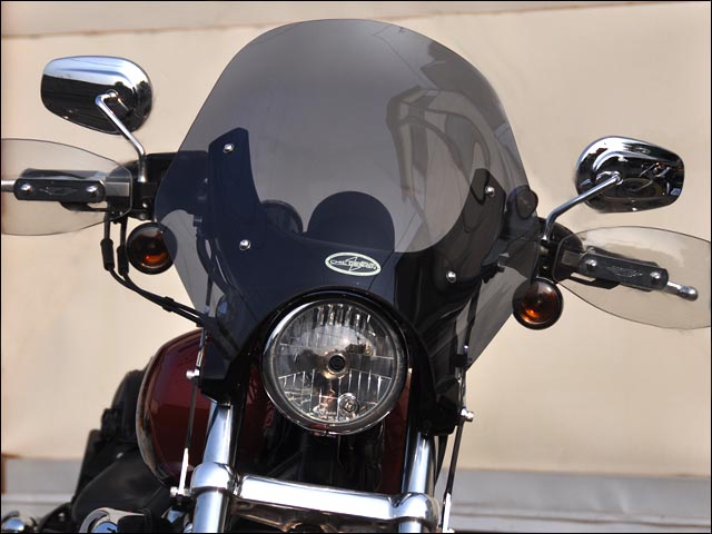 スタイリッシュさと実用性を兼ね備えたウインドシールド。美しい三次元曲面を描くスクリーンは、3mm厚のポリカーボネイト製。フルフェイスヘルメット装着を想定した設計で高速走行時に高い防風性能を発揮し、ライダーの疲労を軽減します。振動に強いラバーマウントによる4箇所固定を採用しています。スクリーンサイズは、縦390mm、横430mm。2011年以降の883L Super Low(スーパーロー)専用品。※商品画像ではサイドマウントステーがメッキ仕上げとなっていますが、製品はブラック粉体塗装仕上げとなります。