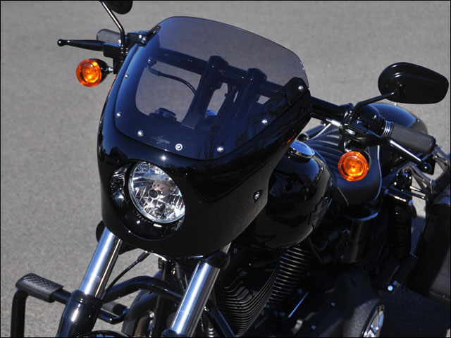 ノーマルカウルよりも大きな帽体とスクリーンで防風性能を高め、迫力あるフロントフェイスを演出します。