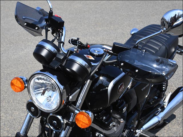 走行風よりライダーの拳や指先を保護するナックルガード。シールド本体はポリカーボネイト製で、色はクリアとスモークから選択できます。十分な強度をもたせた取付けステーは高い風圧を受けてもガタツキが出ないように考慮された形状を持ち、左右のミラーに共締めするだけのボルトオン設計です。