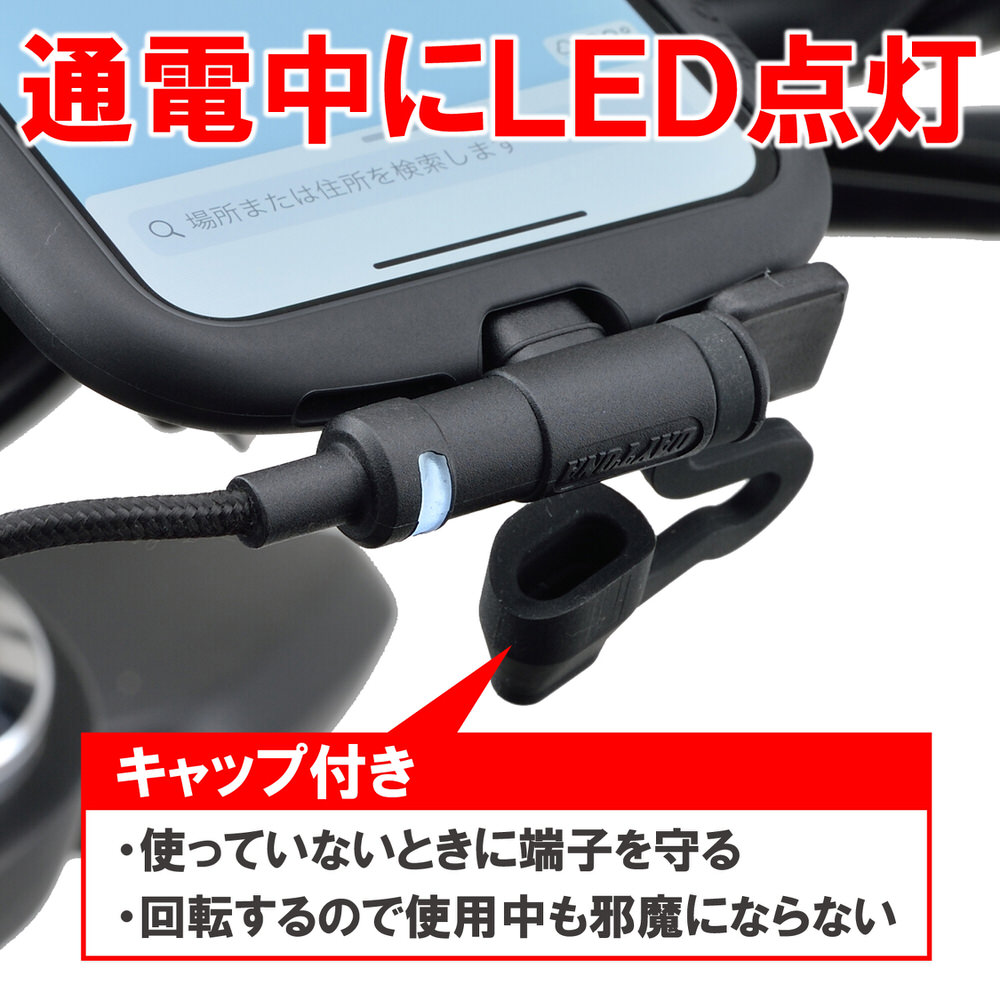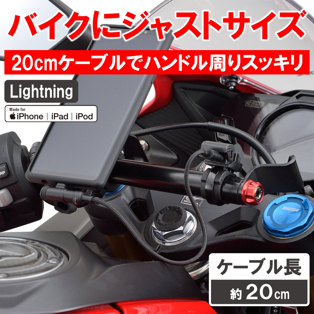 張り出しの少ないコンパクトなL字型コネクターを採用することで、スマートフォンを自由な場所に取り付けできる電源ケーブル。バイクにぴったりな長さ20cmのコードはハンドルまわりで邪魔になりません。Lightning用(15610)はMFi認証を取得しているので安心です。入力コネクタ:Type-A出力コネクタ:Lightning(15610)L型(MFi認証)ケーブル長:約20cm対応電力:最大18W(5V/3A、9V/2A、12V/1.5A)データ:最大480Mbps 転送速度(60MB/s)※データ転送に使用する場合、コネクター内に異物や汚れがないか確認をしてください。データの損傷、破損に対して保証は致しかねます。※LEDは通電中単色(白)で点灯し続けます。※防水機能はありません。※本商品は日本での使用を前提としております。