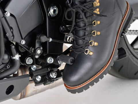 マウンテンブーツをモチーフとしたバイク用ブーツ。普段履きでも使えるアウトドアに適したデザインでバイク乗車を考えた機能を確保。脱着しやすいサイドファスナー式。シフトパッド、くるぶしパッド内蔵。ソールのステップ部に滑り止め加工。内側の金具はハトメに変更し愛車を傷から守ります。3E相当幅広設計。※防水機能はありません。