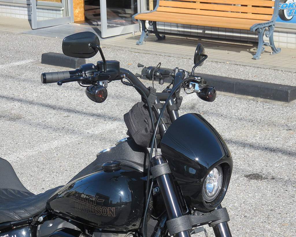 色:ブラック素材 スチール適合車種 電子制御スロットル採用車両サイズ全幅約820mm 高さ:約370mm プルバック約135mmエンドライズ約:380mm グリップ取り付け部 約190mm対応ライザーボルト:1/2-13内容物ハンドル本体×1本注意事項ロットによっては皮膜が厚い為、純正のようにグリップエンド部分の塗装を剥がしている物があります。配線穴があります。迫力あるスタイルが人気のファットバー、更に迫力のライザーバースタイルです。太い部分が1-1/4in、細い部分が1inです。ライザー部分も迫力の1-1/4in!バイクがさらに大きく見えますよ。