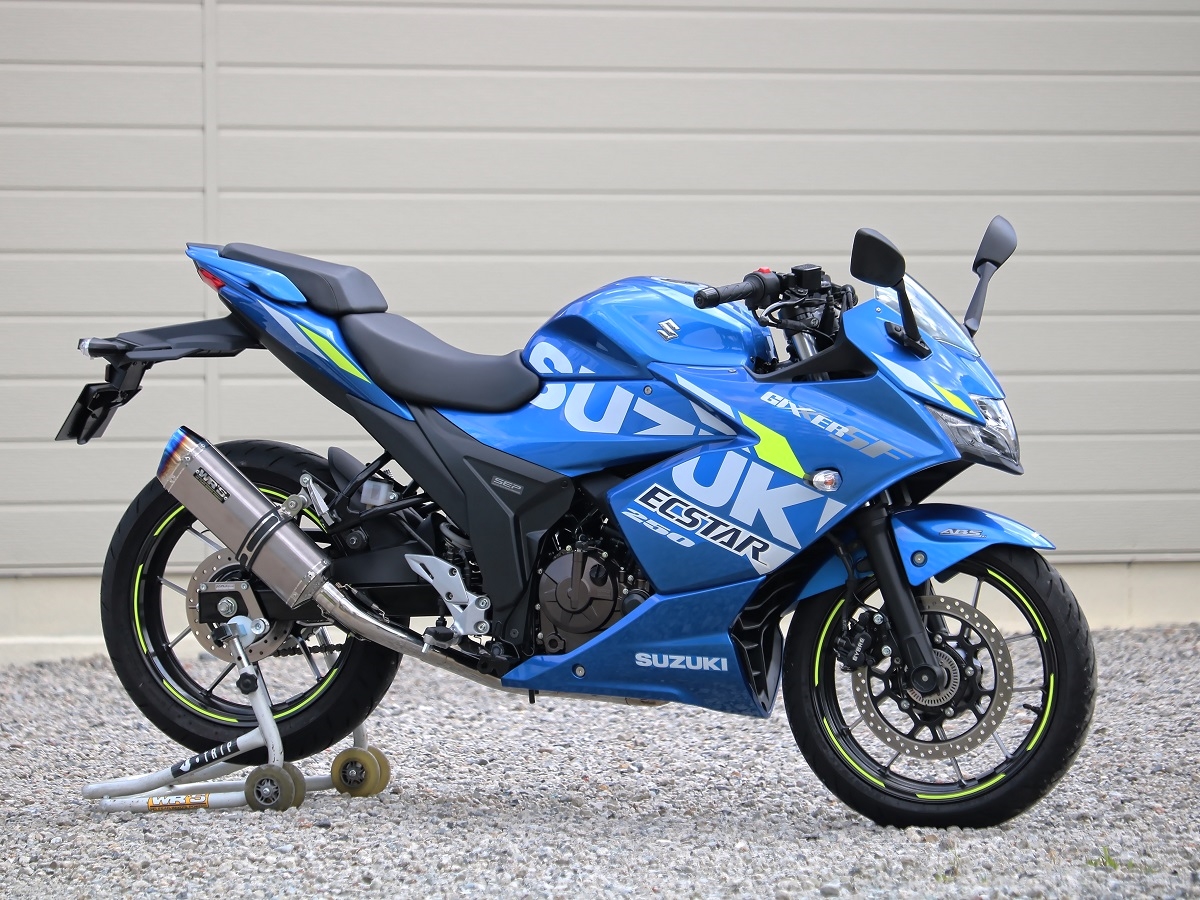 ソリッドチタン仕様:重量3.68kg(ノーマルマフラーは6.89kg。 ボルトを含んだ重量)ベンチテストにより徹底的に性能をチェック、ジクサー250/SF250の特性をより活かすべく開発しました。パイプワークを駆使し管長及び適切なパイプ径を求めシャーシダイナモでベンチテストを繰り返し行い、アクセルレスポンスの強化、低速域をスポイルする事無く常用域である低中速域からパワーが立ち上がり、中高速域からは大幅なパワーの上乗せに成功。ギクシャクするエンジンブレーキも緩和してくれます。SS-OVAL仕様は中速域に重点を置いた仕様で実用域の快適さを目指しつつ、高回転域においても圧倒的なパワーアップにより、全域で乗っていて楽しいマフラーに仕上がりました。低音の効いた音質はシングルテイストをしっかり感じがらもジェントルなサウンドに仕上げており、アクセルを開けた時の不快な破裂音をしっかり抑制し、乗っていて疲れない音質を目指しました。またSS-OVALにステンレスシェルタイプを新たにを採用。奥行きのある深い光沢感とチタンエンドピースの焼き色が絶妙なバランスでマッチしており、リーズナブルな価格でありながら高級感のある仕上がりとなっています。