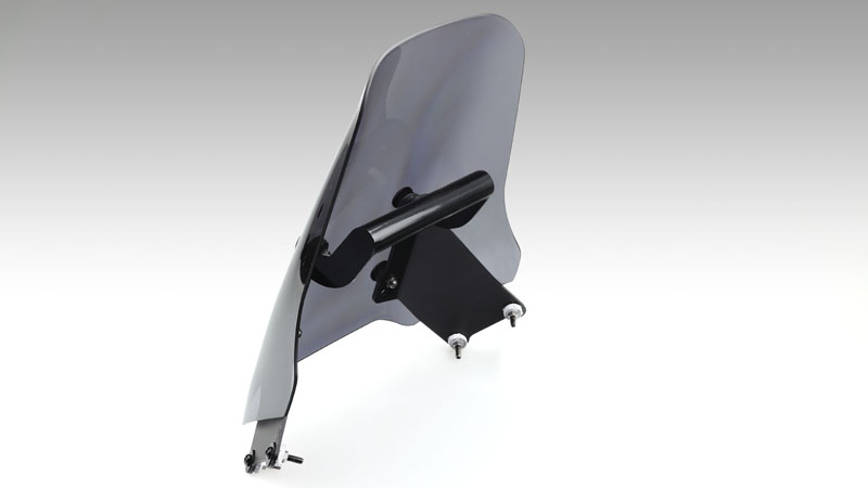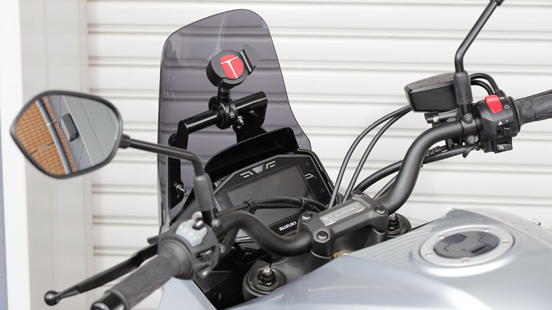 新型KATANAのスタイルに合わせたカタナらしいメーターバイザーが登場!外観美と実用性に拘ったデザインに加え、マウントバーを設置し、スマホなどデバイスを見やすい位置へ取付けできるような仕様となっております。※画像のテックマウントは別売です。(TM-430913TGP)【特徴】スクリーンは取り付け位置で15mm上下に調整可能。スクリーンの傾きも0〜5度で調整出来ます。【マウントバーサイズ】直径:22.2mm 有効長:130mm【材質】ポリカーボーネート/スチール【色】スモーク/ブラック
