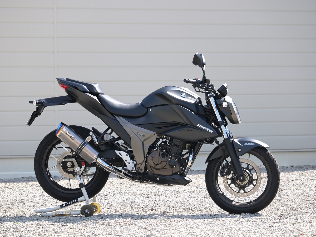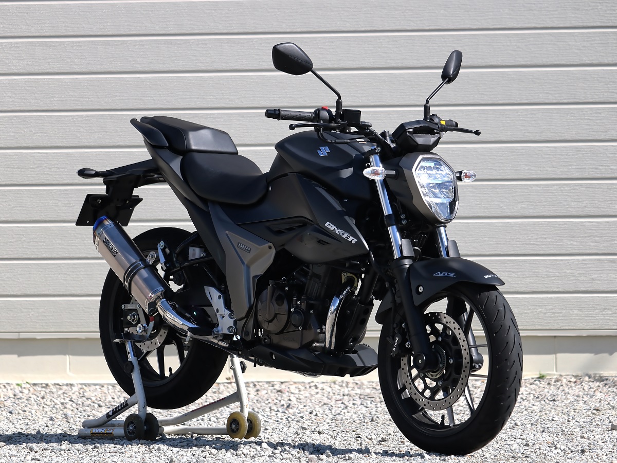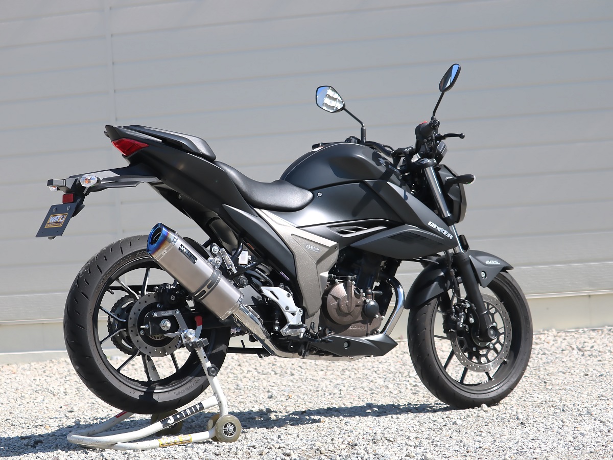 ソリッドチタン仕様:重量3.68kg(ノーマルマフラーは6.89kg。 ボルトを含んだ重量)ベンチテストにより徹底的に性能をチェック、ジクサー250/SF250の特性をより活かすべく開発しました。パイプワークを駆使し管長及び適切なパイプ径を求めシャーシダイナモでベンチテストを繰り返し行い、アクセルレスポンスの強化、低速域をスポイルする事無く常用域である低中速域からパワーが立ち上がり、中高速域からは大幅なパワーの上乗せに成功。ギクシャクするエンジンブレーキも緩和してくれます。SS-OVAL仕様は中速域に重点を置いた仕様で実用域の快適さを目指しつつ、高回転域においても圧倒的なパワーアップにより、全域で乗っていて楽しいマフラーに仕上がりました。低音の効いた音質はシングルテイストをしっかり感じがらもジェントルなサウンドに仕上げており、アクセルを開けた時の不快な破裂音をしっかり抑制し、乗っていて疲れない音質を目指しました。またSS-OVALにステンレスシェルタイプを新たにを採用。奥行きのある深い光沢感とチタンエンドピースの焼き色が絶妙なバランスでマッチしており、リーズナブルな価格でありながら高級感のある仕上がりとなっています。
