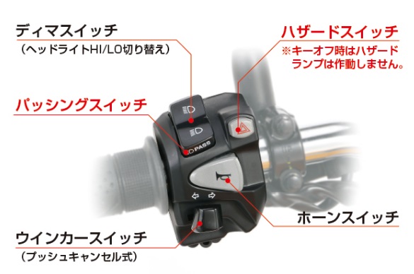 カプラーオンハザードスイッチ、パッシング機能追加LEDウインカーリレー付属※取り付けにはハンドル穴開け加工が必要です。(穴開け加工用型紙付)ノーマルには搭載されていないハザード機能とパッシング機能が備わったハンドルスイッチです。車種専用ですので、カプラーオンで装着可能。ウインカーリレー付属※ウインカーブザーの機能はありません。