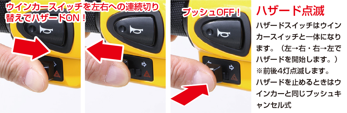 カプラーオンハザード&パッシング機能追加フラッシャーリレー(ウインカーブザー機能はありません)、ウインカーリレーサスペンション付属※取り付けは車両のサービスマニュアルを参照して下さい。ディマスイッチ、ウインカースイッチ、ウインカーリレーを交換するだけハーネス加工不要スーパーカブ110(JA10)にハザード・パッシング機能を追加するスイッチSETです。