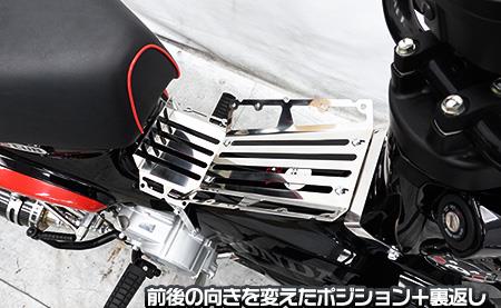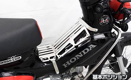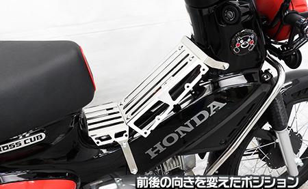 実用性を追求したセンターキャリアが完成しました。シート〜ハンドル間のデッドスペースを荷物置き場として有効活用できます。他には無いデザインとなっており、アウトドアテイストあふれるクロスカブの魅力を更に引き出します。車体のラインにフィットするデザインに仕上げていますので、取って付けたような違和感は無く、ワイルドなカスタム車に仕上がります。キャリアプレートは前、後、裏、表と、荷物の形や大きさ、使用用途によってポジションを変更することができます。ポジションチェンジは付属のレンチを使用して、短時間で簡単に変えることができます。取り付けのため他に用意するパーツ等はありません。取り付けに必要なボルトナット類も付属しており、無加工で取り付けできます。