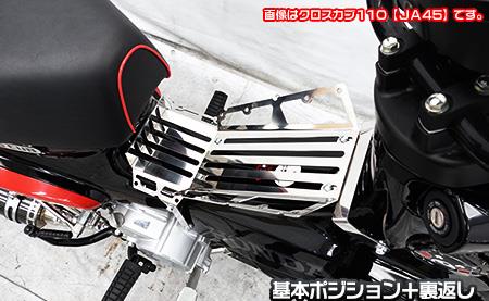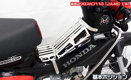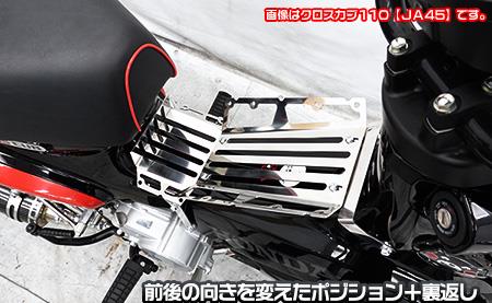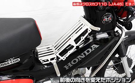 実用性を追求したセンターキャリアが完成しました。シート〜ハンドル間のデッドスペースを荷物置き場として有効活用できます。他には無いデザインとなっており、アウトドアテイストあふれるクロスカブの魅力を更に引き出します。車体のラインにフィットするデザインに仕上げていますので、取って付けたような違和感は無く、ワイルドなカスタム車に仕上がります。キャリアプレートは前、後、裏、表と、荷物の形や大きさ、使用用途によってポジションを変更することができます。ポジションチェンジは付属のレンチを使用して、短時間で簡単に変えることができます。取り付けのため他に用意するパーツ等はありません。取り付けに必要なボルトナット類も付属しており、無加工で取り付けできます。